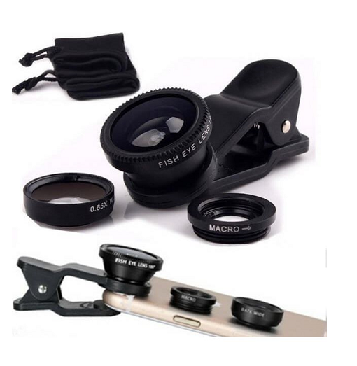Techsuit- σετ φακών για κάμερα τηλεφώνου (W33), macro, wide angle, fish eye HD glass with E-clip, με κάλυμμα φακού μαύρο.